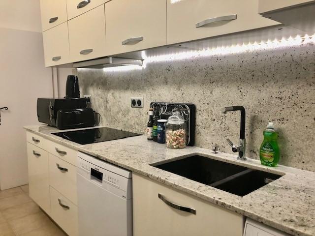 La cuisine, séparée et équipée, allie praticité et espace de rangement optimisé avec accès patio