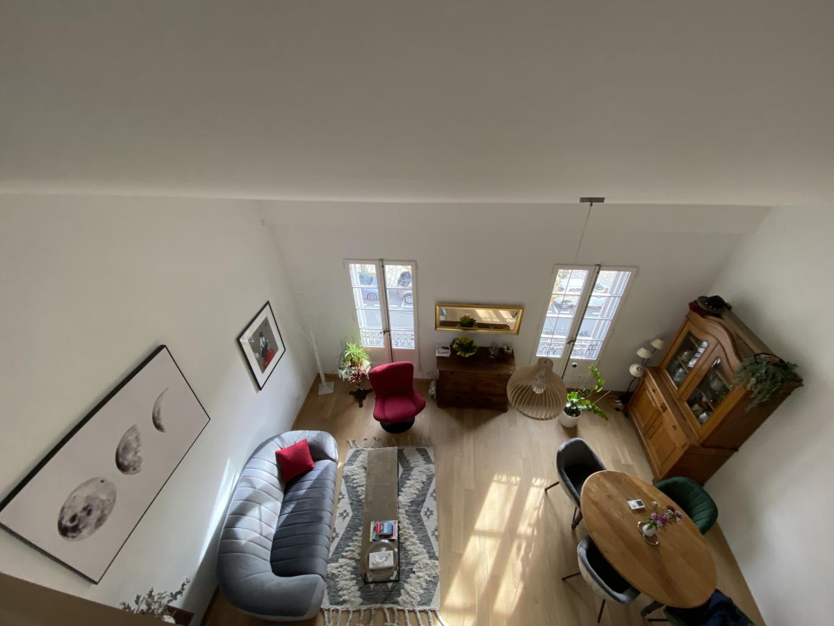 Appartement d'environ 92 m² (loi carrez) en duplex refait à neuf (2ème et 3ème étage) comprenant : dégagement, séjour , cuisine ouverte, une chambre, salle de bains avec sanitaire, espace buanderie, au 2ème niveau pièce salon TV, salle d'eau, une deuxième chambre.