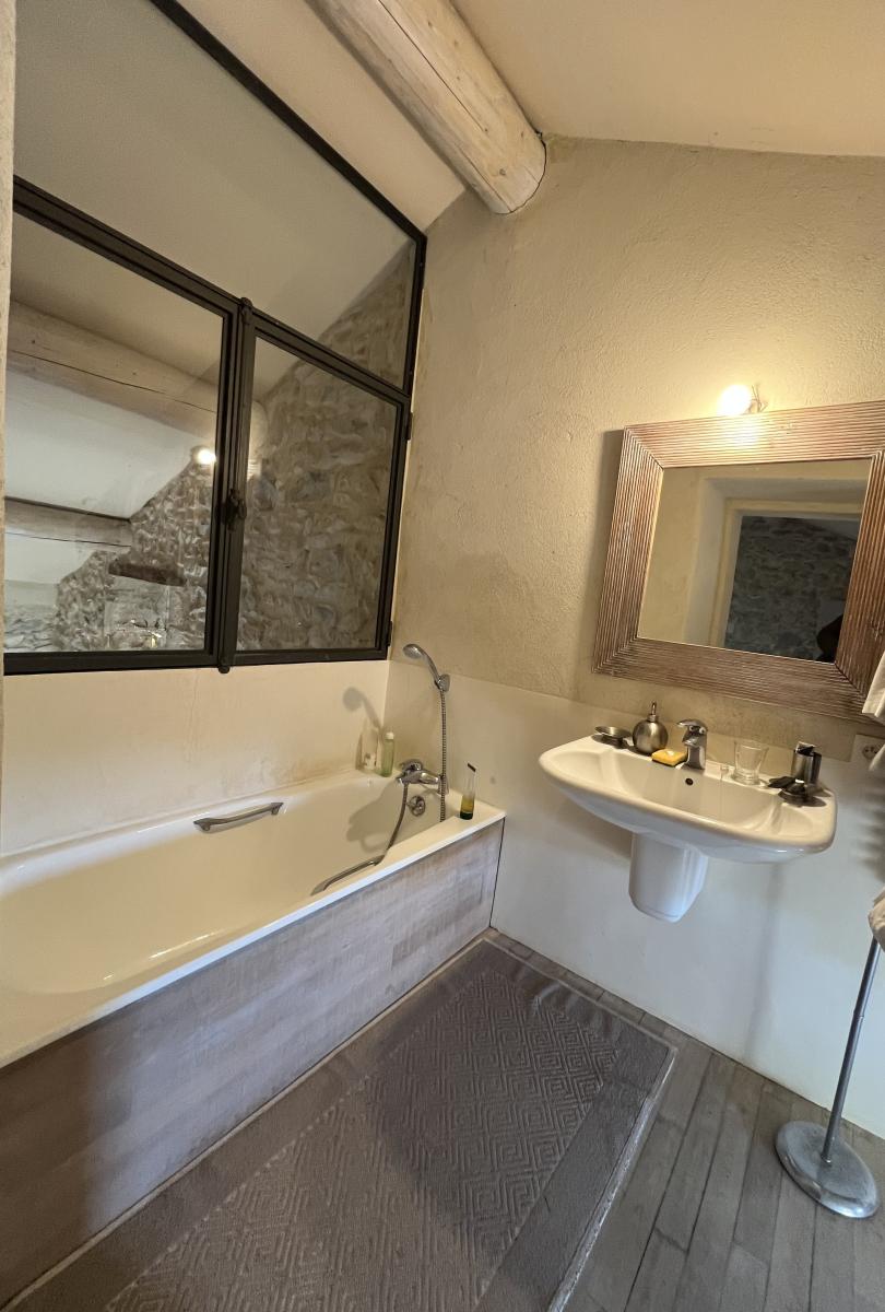 Dans le 2ème bâtiment, au rdc une grande salle servant de home cinéma, de grand salon et de bibliothèque donnant sur la cour avec l'olivier. A l'étage, vous trouverez un grand salon/bibliothèque avec une chambre en mezzanine, une salle d'eau ainsi qu'un dressing. Cette propriété possède en copropriété une grande piscine ainsi que 2 terrains de tennis.